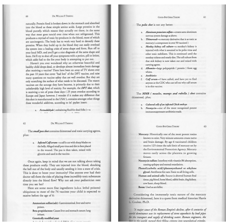 The book Goodbye Germ Theory by Dr. William Trebing, Sick and Tired, Reclaim Your Inner Terrain and A Second Thought About Viruses, Vaccines and the HIV/AIDS Hypothesis by Dr. Robert O. Young, are compelling must-reads, offers educative insight into the dangers of all vaccines, showing clearly what is contained in the substances being pumped into our children–over 70 vaccines in the USA by age six–starting from their day of birth and shot into their veins at 2 months, 4 months, 6 months, 1 year and so on in regular intervals for a slew of supposedly deadly diseases, which in fact lead to childhood cancers, auto immune diseases, autism and neurological disorders, and more.