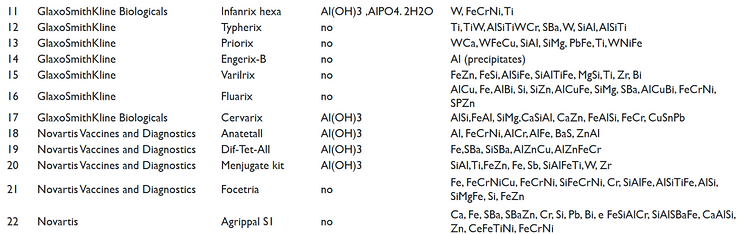 Excerpt, Table 2 showing nanometallic ingredient findings in vaccines, Gatti AM, Montanari S. New quality-control investigations on vaccines: micro- and nanocontamination. Int J Vaccines Vaccin. 2017;4(1):7‒14. DOI: 10.15406/ijvv.2017.04.00072
