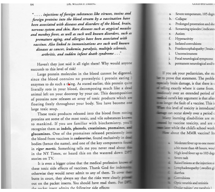 Further, the putrefying proteins in the blood and/or interstitial fluids post-vaccine, whether one day after or several years after, release highly toxic chemicals into the bloodstream known to biochemists as dangerous and disease-causing: indols, creatinines, phenols, each of these further degrading the blood, the vitality, brain, and health of the “educated-to-be-vaccinated” subject.