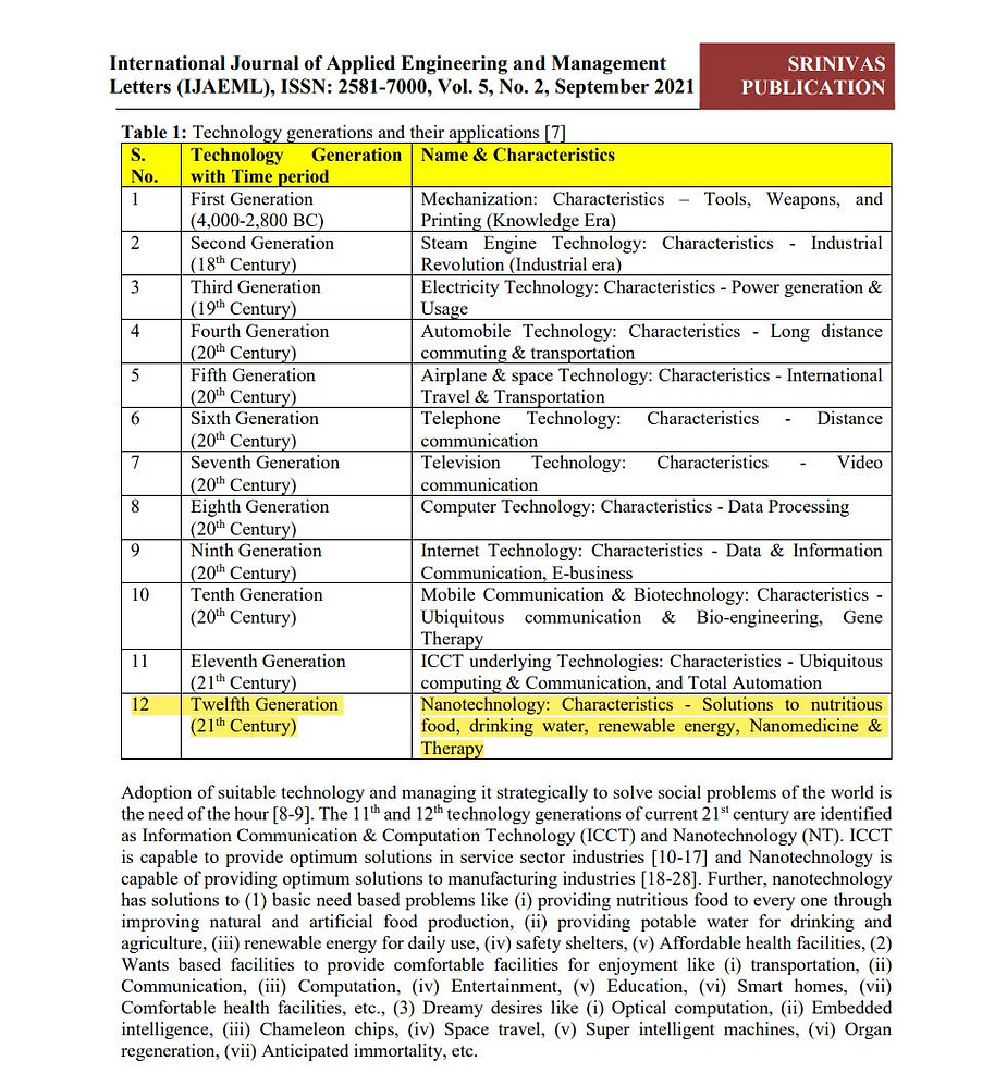 The branches of NT including Nanomaterials Design Technology, Nanomaterial fabrication, Nanomaterials characterization, Nanomechanics technology, Nanoelectronics Technology, Nanophotonics Technology, Nanobiotechnology, and Nanomedicine, are expected to change the rules of development games [36] in many areas including Agriculture & food industry, Drinking water systems [37], Efficient Automobiles [38], Renewable energy systems [39-41], High speed optical computers, Low cost durable shelters, Embedded intelligence, Space vehicles, Health & Medical solutions [42-43], etc in all member countries by 2030. This will allow human beings to become ubiquitous and provides total automated products and services for individuals and hence acts as a pillar of social, technological, and economical transformation [32].