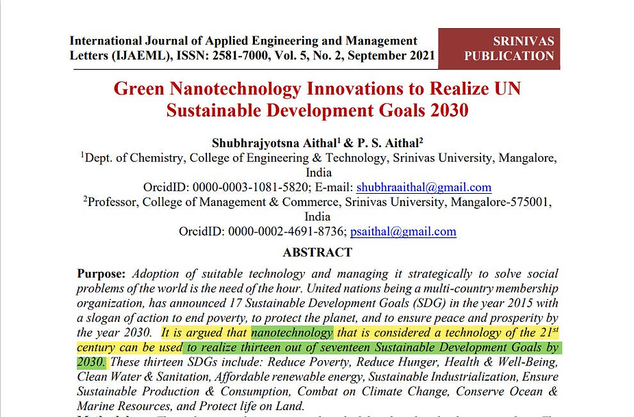 (1) Green nanotechnology innovations support to minimize poverty by solving basic need-based problems of citizens of the countries.