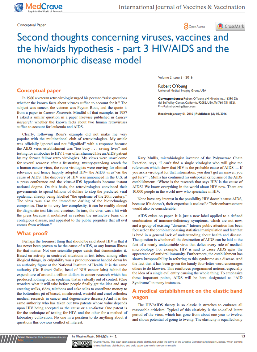 Citation: Young RO (2016) Second Thoughts about Viruses, Vaccines, and the HIV/AIDS Hypothesis – Part 1. Int J Vaccines Vaccin 2(3): 00032. DOI: 10.15406/ijvv.2016.02.00032