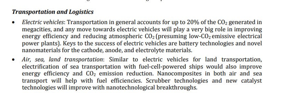 In the next decade, we envision that research in nanoscience and nanotechnology will enable realization of new technologies such as low-cost photovoltaics for solar power generation, new classes of batteries for both transportation and grid-connected energy storage, efficient low-cost methods of converting both solar and electrical energy into chemical fuels, new catalysts and catalyst systems enabling artificial photosynthesis and utilization of CO2 as a feedstock, ultrahigh surface area materials for energy storage, new membranes for applications such as water and gas purification, and improved thermoelectric and electrocaloric devices for more efficient conversion between heat and electricity.