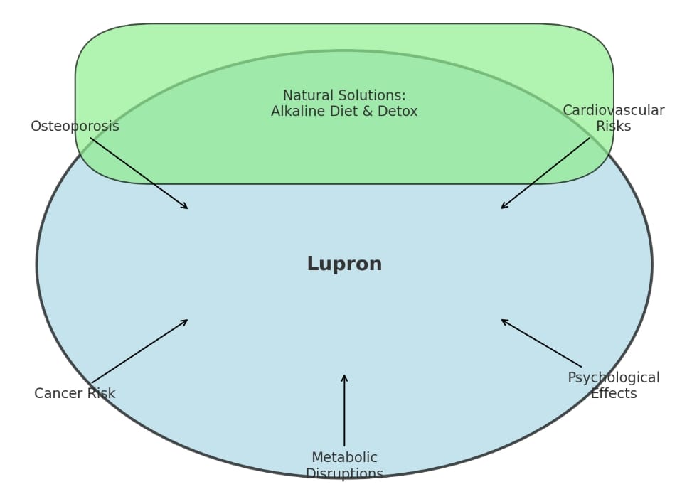 Lupron, gonadotropin-releasing hormone agonist, hormone therapy, prostate cancer, endometriosis, transgender hormone therapy, glandular dysfunction, alkaline interstitial environment, osteoporosis, cardiovascular risk, cancer risk, metabolic waste products, acidic diet, electromagnetic radiation, chemical exposure.
