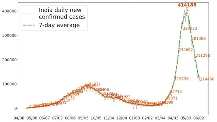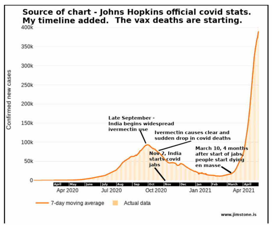 The statistic below reveal what has happened in India with increased CoV – 2 – 19 cases, injuries and death as a result of the VAXX! The daily confirmed cases reversed when an Indian Judge of the Supreme Court ruled in favor for the free use of alkalizing agents, including Hydroxychloroquine and Ivermectin in the treatment of CoV – 2 -19 symptomologies.