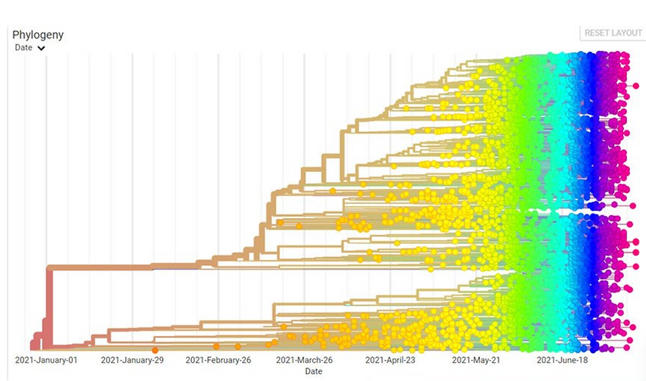 [The genetic sequences shown above have been submitted to GISAID – a global science initiative that provides open access to genomic data of the Sars-Cov – 2 coronavirus. Each dot represents a different Sars-CoV – 2 – 19 sequence and therefore a different “variant”. There are over 40,000 in total.]