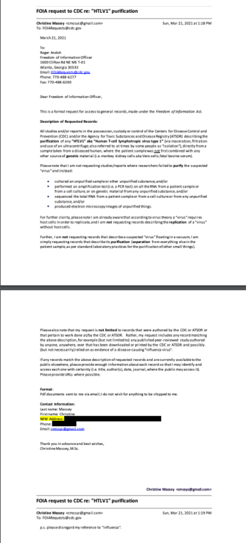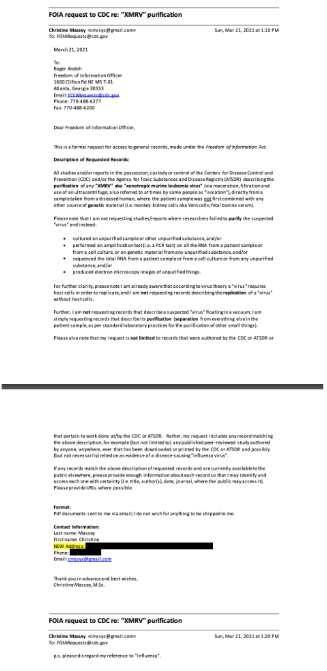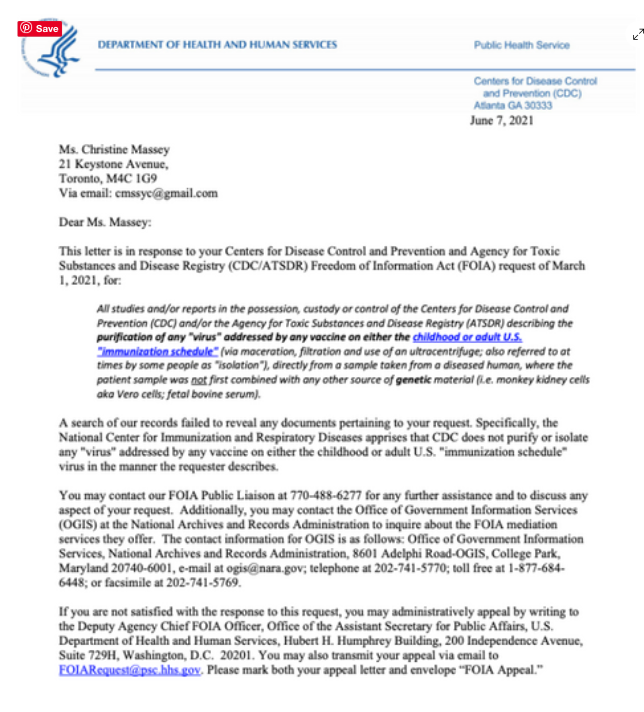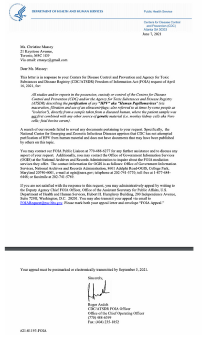 [2] June 7, 2021: CDC admits they have no record of any “HPV virus” purified from any patient sample via maceration, filtration and use of an ultracentrifuge, by anyone, anywhere, ever: (note: CDC made an error in their original response and later provided the corrected version below):