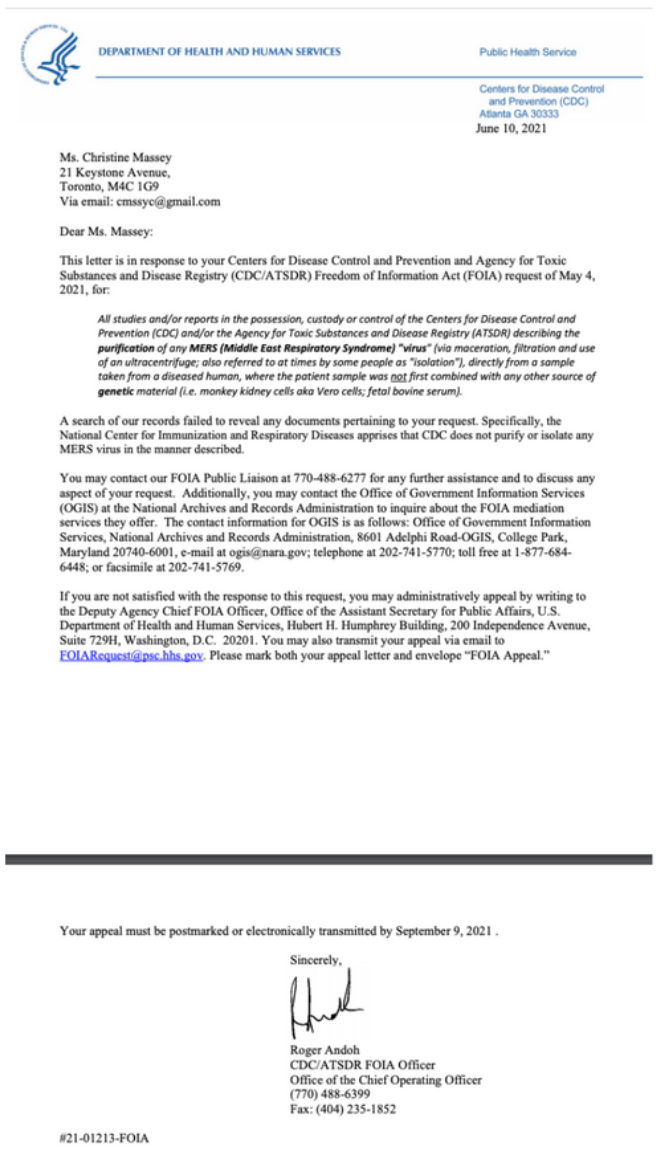 [5] June 10, 2021: CDC admits they have no record of any “MERS virus” purified from any patient sample via maceration, filtration and use of an ultracentrifuge, by anyone, anywhere, ever: