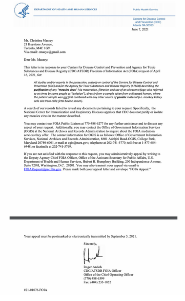 [3] June 7, 2021: CDC admits they have no record of any “Measles virus” purified from any patient sample via maceration, filtration and use of an ultracentrifuge, by anyone, anywhere, ever! No Isolation, No Purification and No Identification for the Measles Virus!