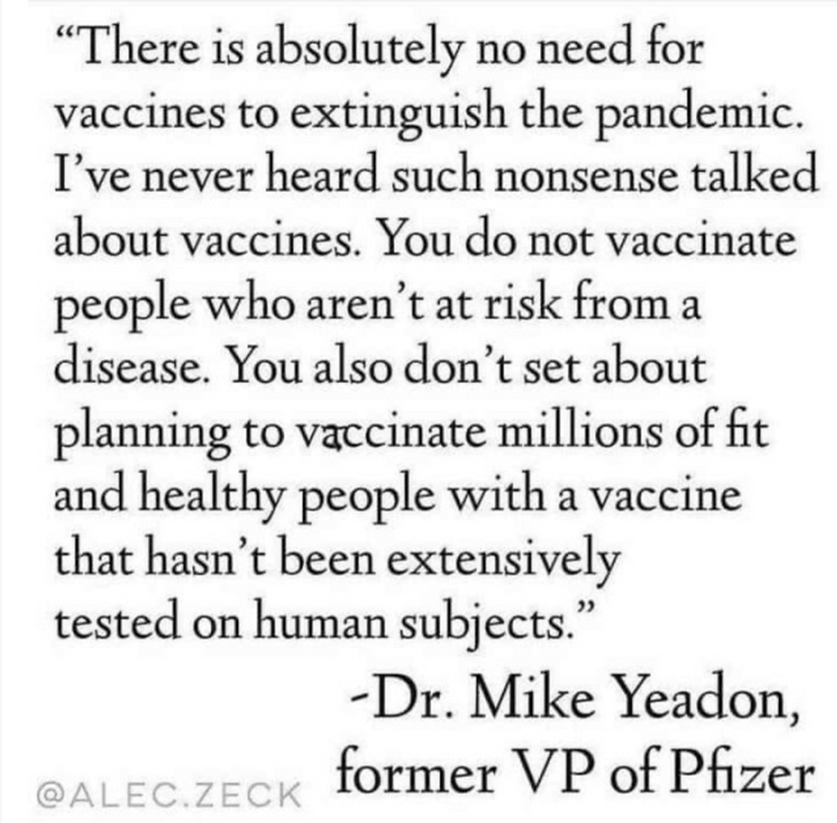 Even pro-vaccine scientists have come to the aid of the public like Dr. Mike Yeadon who was with Pfizer for 20 years, as V.P. and Chief Scientist. Dr. Yeadon stated: “You do not vaccinate when there is no threat of disease.” https://rense.com/general96/mike-yeadon.php