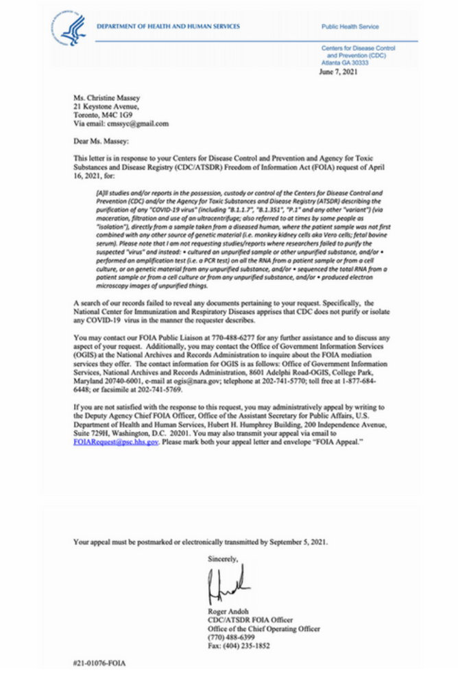 [1] June 7, 2021: CDC admits they have no record of any “COV – 2 or 19 virus” purified from any patient sample via maceration, filtration and use of an ultracentrifuge, by anyone, anywhere, ever: