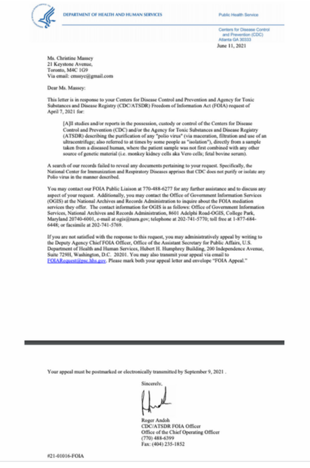 [6] CDC June 11 2021: CDC admits they have no record of any “POLIO virus” purified from any patient sample via maceration, filtration and use of an ultracentrifuge, by anyone, anywhere on the planet, ever: