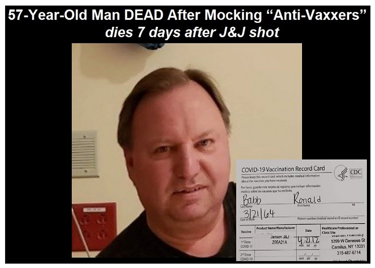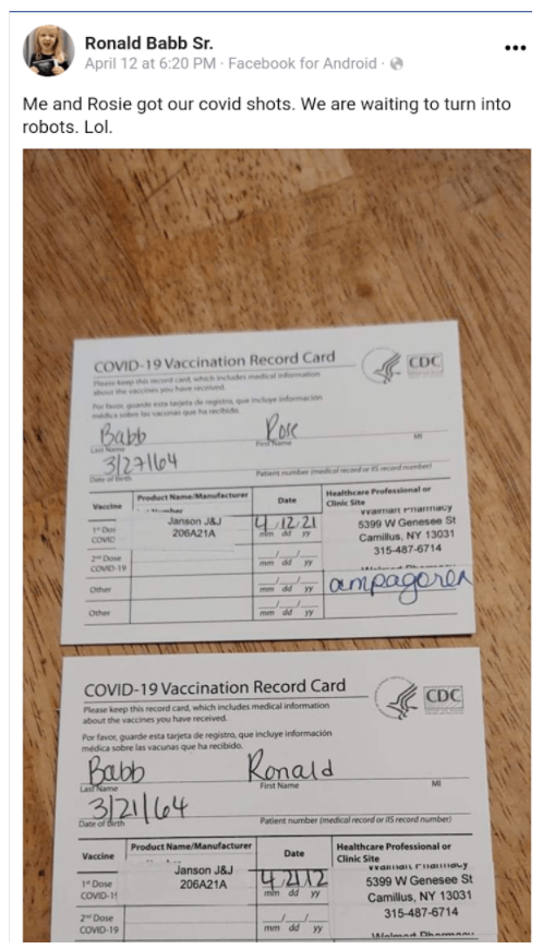 Mr. Ronald Babb, Sr. and his wife Rose, received the experimental Johnson & Johnson viral vector shot on April 12, according to his Facebook page. They received the shot at a Walmart on Genessee Street in Camilius, New York, about 14 miles west of Syracuse. Mr. Babb posted he and his wife’s “vaccine cards” on Facebook with a caption saying they are now waiting to “turn into robots.”