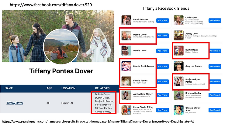 The following is a death notice for someone with the same name, address, and age as nurse Tiffany, including relatives that match her Facebook account found on a website called SearchQuarry.