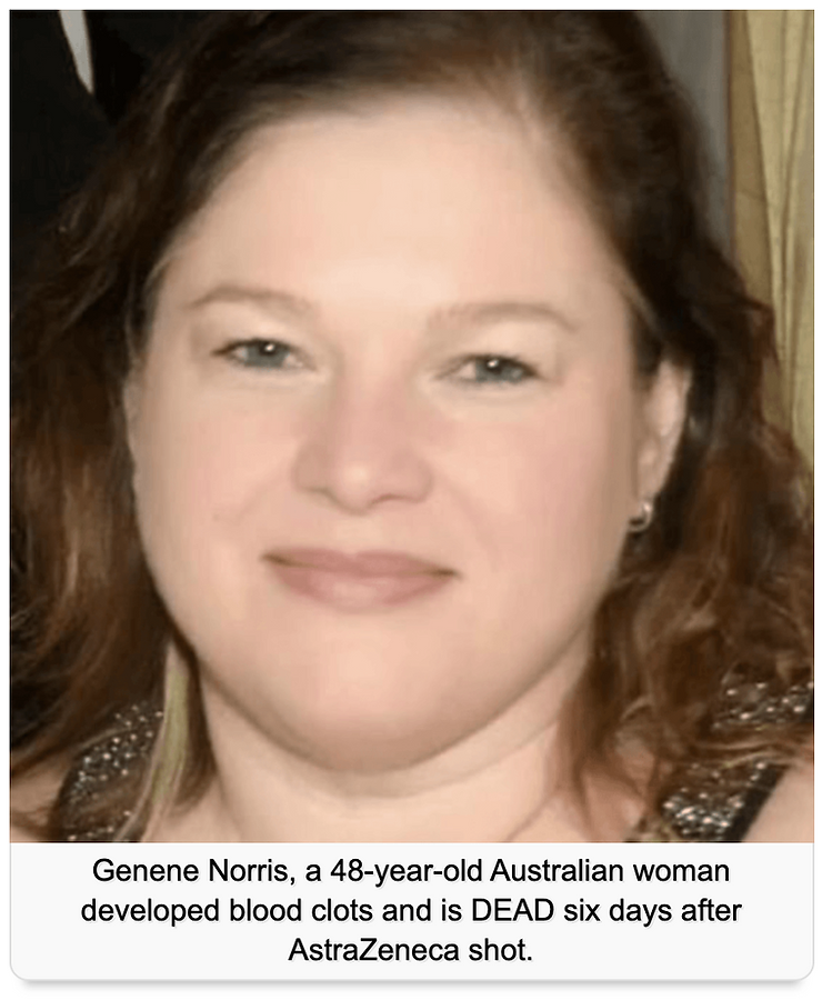 Genene Norris, a 48-year-old Australian woman developed blood clots and is DEAD six days after AstraZeneca shot.