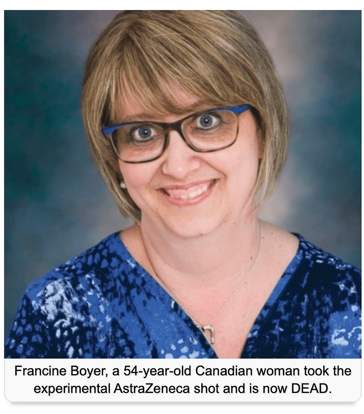 Francine Boyer, a 54-year-old Canadian woman took the experimental AstraZeneca shot and is now DEAD.