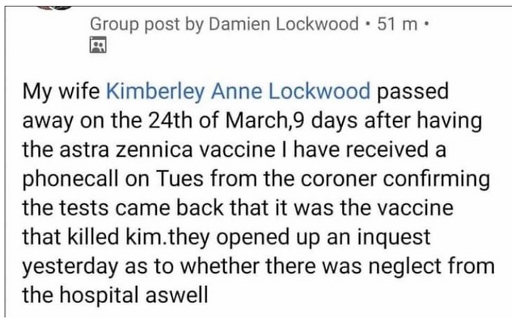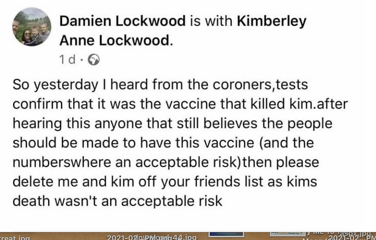 Damien made an additional post on May 12, 2021 stating that it has been confirmed by the coroner that the vaccine caused Kimberley’s death.