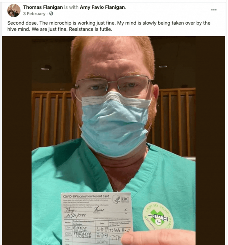 Dr. Thomas Flanigan received the first dose of experimental Moderna mRNA on January 6, according to his Facebook page. He received the second dose on February 3.