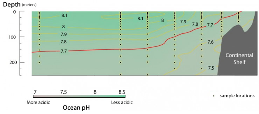 Bottom water naturally contains more CO2 than at shallower depths. This scientific team argues that human emissions have pushed these levels even higher, contributing to pH values as low 7.5 in waters heavily used by US fishermen.