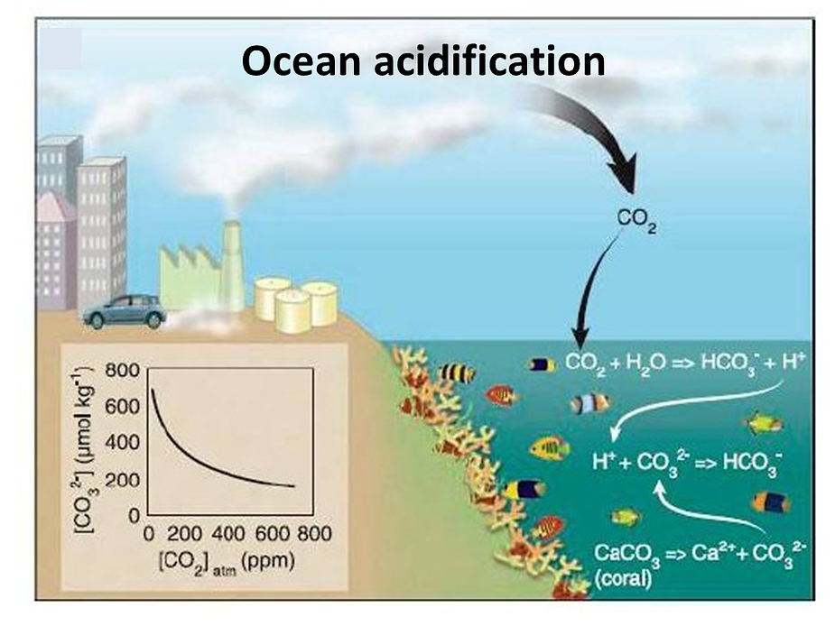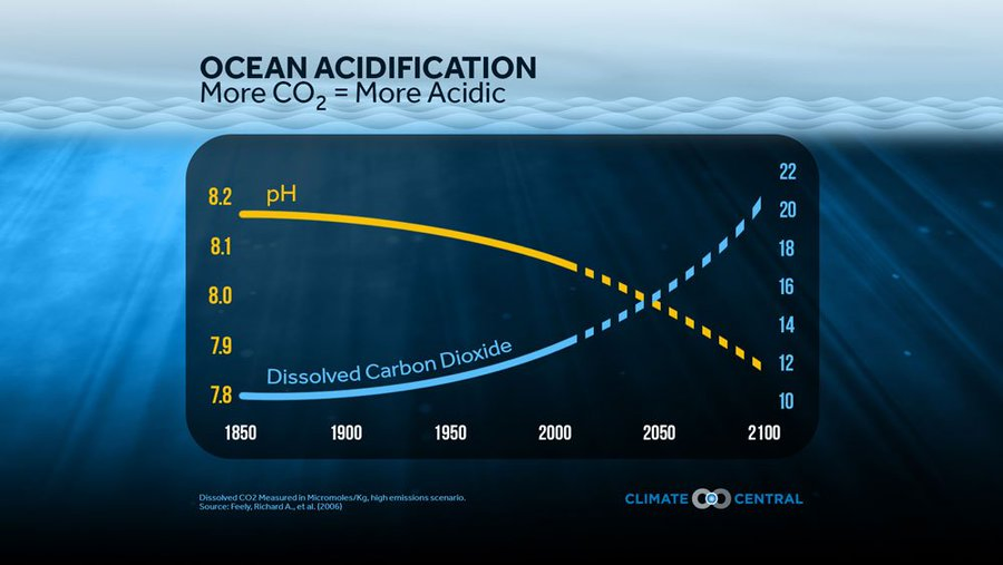 The oceans are thought to have absorbed about half of the extra CO2 put into the atmosphere in the industrial age. This has lowered its pH by 0.1 pH and is the measurement for acidity and alkalinity.