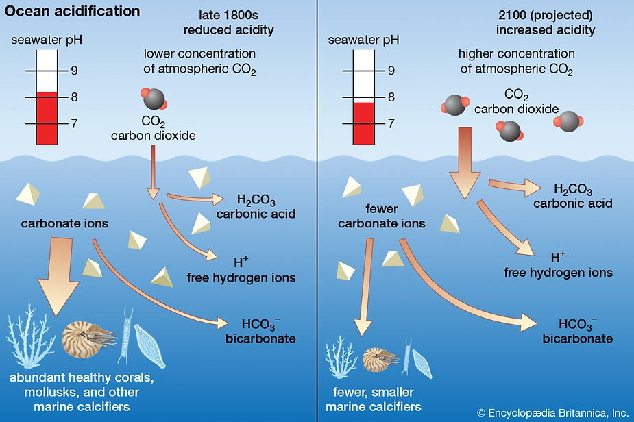 As water becomes more acidic, the concentration of calcium carbonate falls. Eventually there is so little that shells or skeletons cannot form.