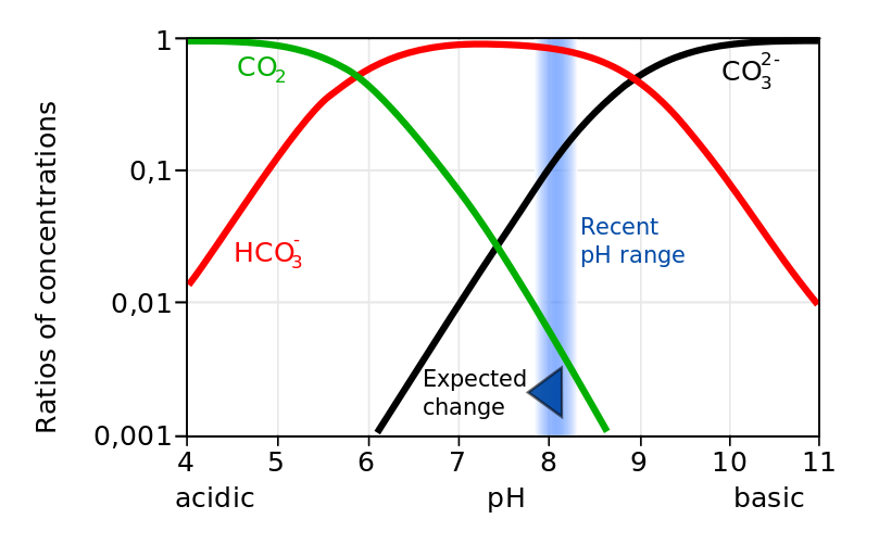 The IPCC forecasts that ocean pH will fall by “between 0.14 and 0.35 units over the 21st Century, adding to the present decrease of 0.1 units since pre-industrial times.”