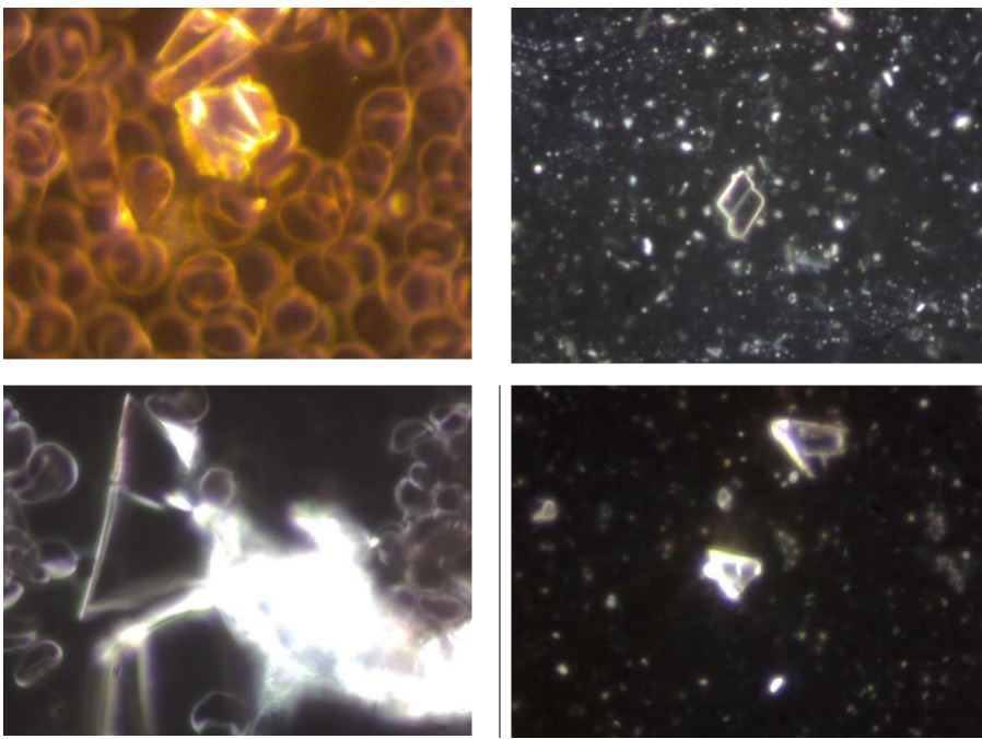 Comparison of crystals in the blood and in the vaccine; on the left, crystalline formations are found in the blood of test subjects vaccinated with Comirnaty (BioNTech/Pfizer), the images on the right show that these types of crystals are also found in Comirnaty vaccines. Image credit: Helen Krenn