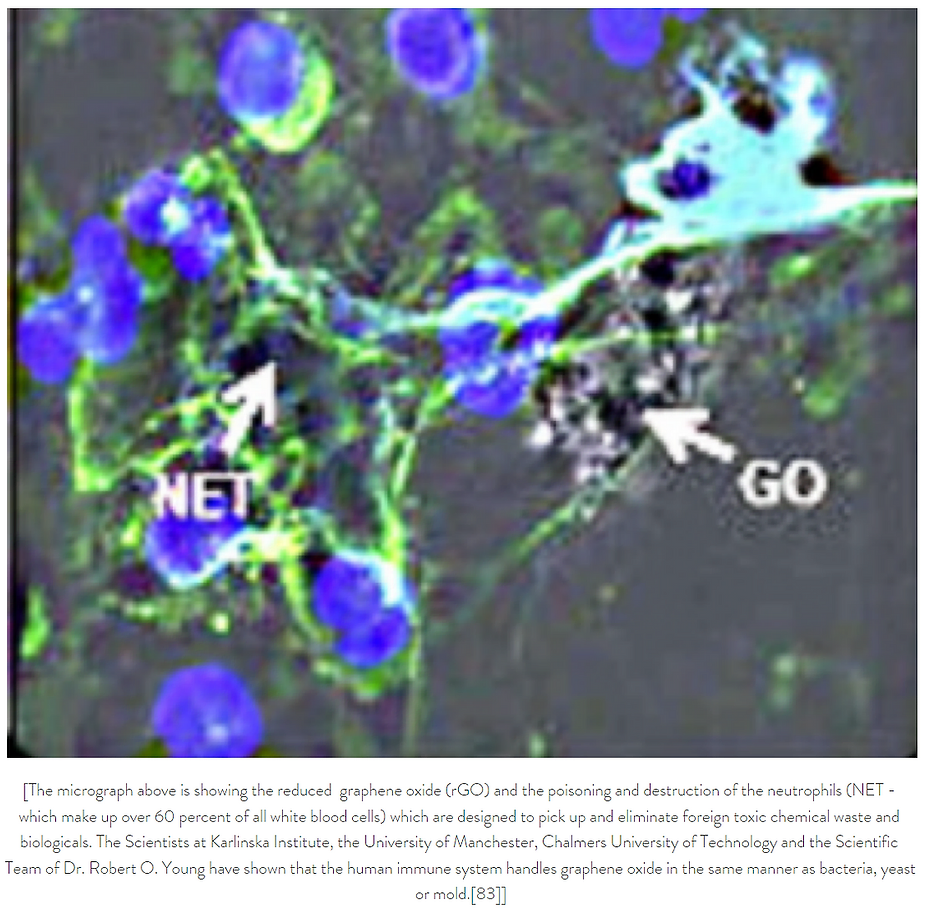 Graphene Oxide inside the body causes thrombogenicity, blood clotting, post inflammatory syndrome or systemic or multi-organ inflammations, causes alteration of the immune system, collapse of the immune system, cytokine storms, neurodegeneration, and mutagenic effects changing the DNA of the host.
