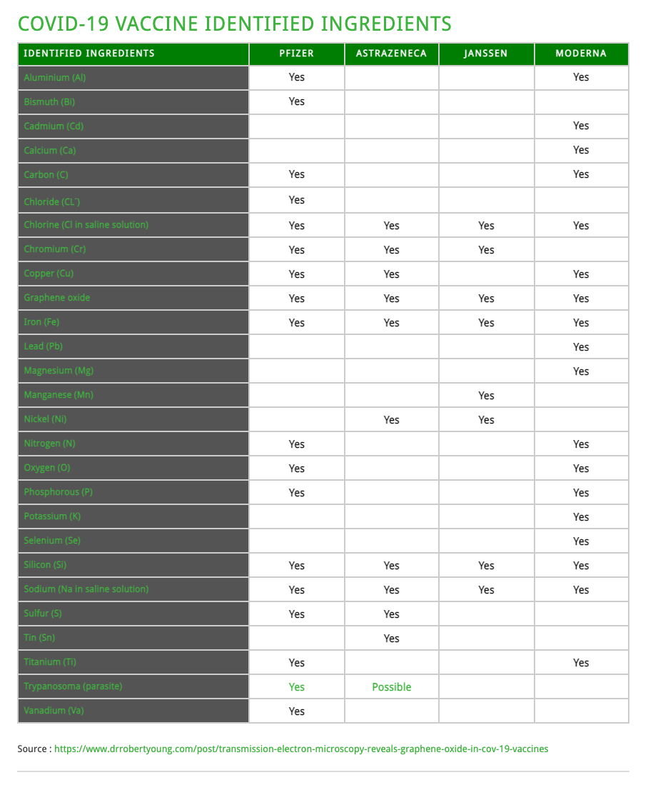 The Working Group for CoV VaXXXine Analysis states that some of the toxic elements found inside the AstraZeneca, Pfizer, and Moderna vaXXXine vials were not listed in the ingredient lists from the manufacturers. The following metallic elements were found in the vaXXXines: