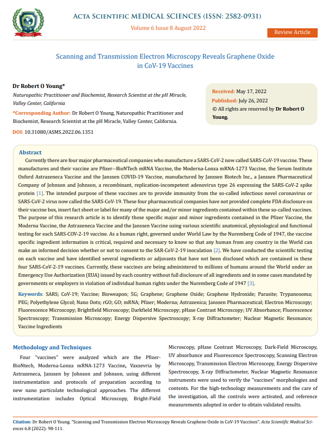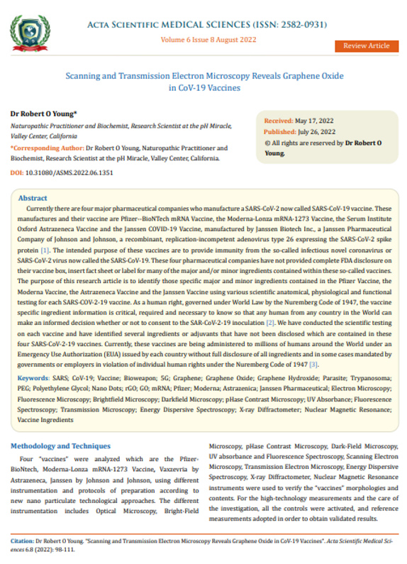 To learn more about the nondisclosed ingredients in the coronavirus vaxxines read my latest peer-reviewed published article by Acta Scientific Medical Science Journal, ASMS-22-RW-150 entitled “Scanning & Transmission Electron Microscopy Reveals Graphene Oxide in CoV-19 Vaccines” The PDF is attached below or you can click on the following link: