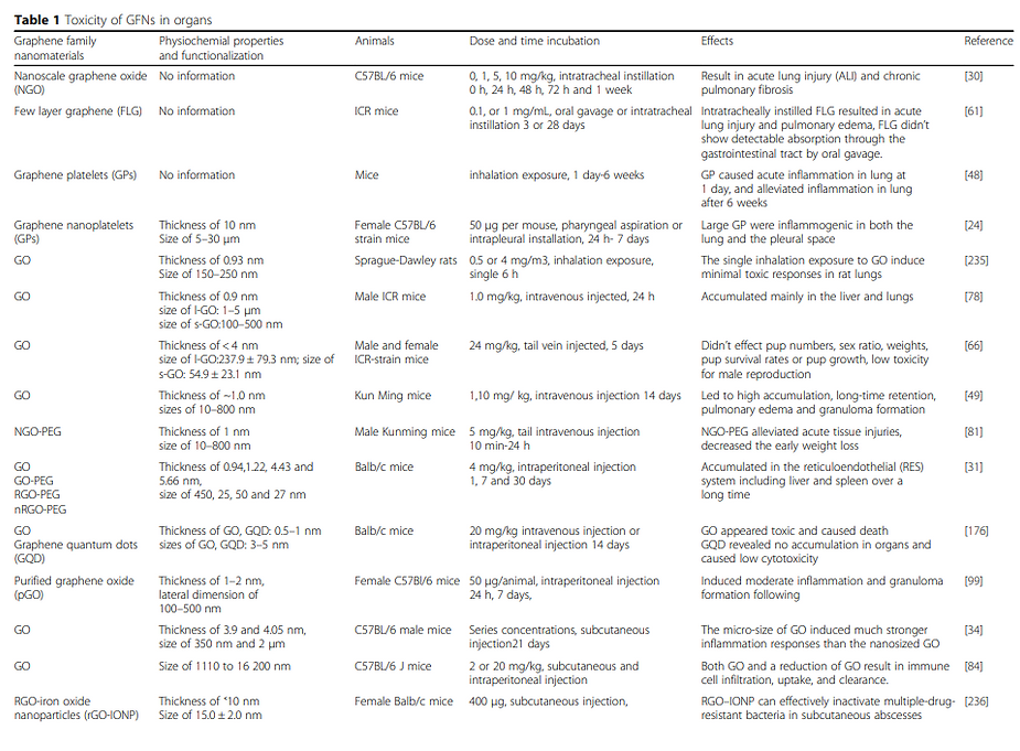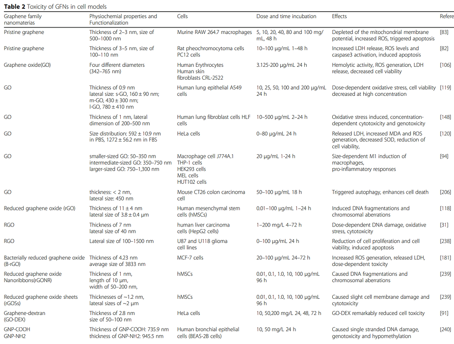 Graphene, Graphene Oxide (GO), carbon nano-tubes, and the entire graphene-family nano-materials (GFN) are toxic in almost all their forms, causing mutagenesis (cancer, chromosomal alteration), cell death, apoptosis, necrosis, and the release of free radicals.