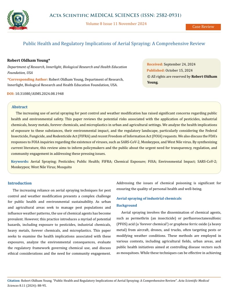 8. Young, R.O. (2024). Public Health and Regulatory Implications of Aerial Spraying: A Comprehensive Review. Acta Scientific Medical Sciences, 8
