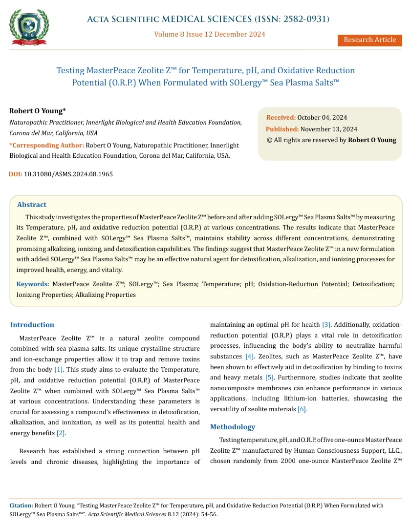 11. Young, R.O. (2024). Testing MasterPeace Zeolite Z™ for Temperature, pH, and Oxidative Reduction Potential (O.R.P.) When Formulated with SOLergy™ Sea Plasma Salts™. Acta Scientific Medical Sciences, 8(12), 54-56. DOI: 10.31080/ASMS.2024.08.1965
