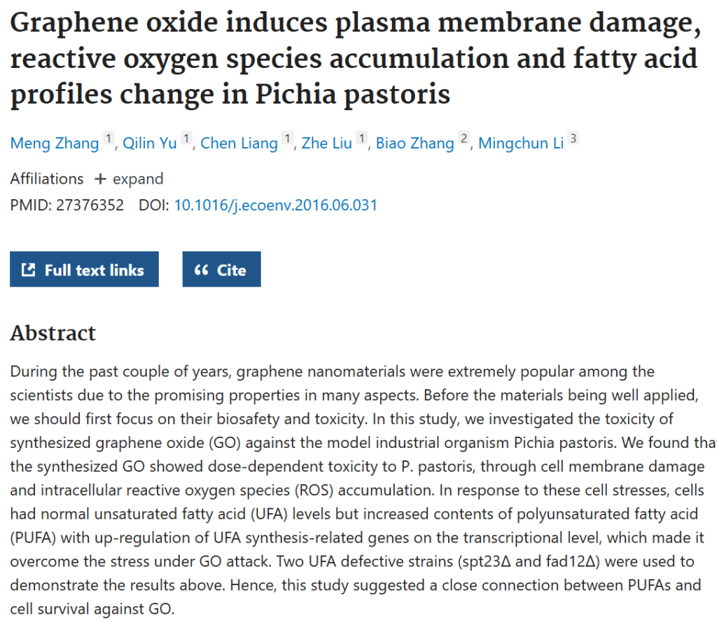 12. Zhang, M., Liu, X., & Jia, R. (2016). Graphene oxide induces plasma membrane damage, reactive oxygen species accumulation, and fatty acid profile changes in Pichia pastoris. Ecotoxicology and Environmental Safety, 132, 372–378. https://doi.org/10.1016/j.ecoenv.2016.06.005