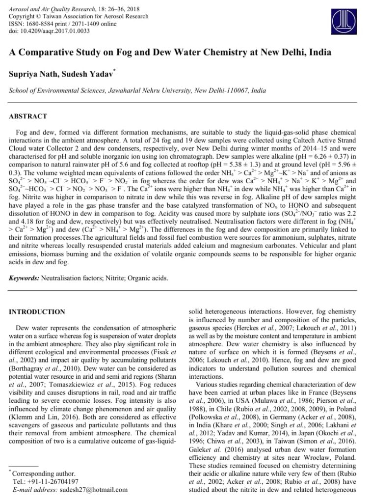 6. Nath, S., & Yadav, S. (2018). A comparative study on fog and dew water chemistry at New Delhi, India. Aerosol and Air Quality Research, 18(4), 907-920. PDF Link Description: This study reveals that fog water in the Indo-Gangetic Plain (IGP) is alkaline, predominantly influenced by ammonium, sulfate, and calcium ions. These findings highlight the impact of agricultural and industrial emissions on fog chemistry in this densely populated region.