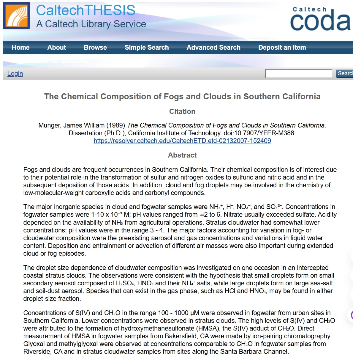 2. Munger, J.W. (1989). The chemical composition of fogs and clouds in southern California. PhD Thesis. California Institute of Technology. PDF Link