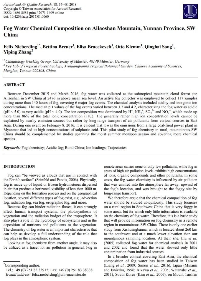 7. Nieberding, F., Breuer, B., Braeckevelt, E. F., Zhang, Y., & others. (2017). Fog water chemical composition on Ailaoshan Mountain, Yunnan Province, SW China. Aerosol and Air Quality Research, 18(1). https://doi.org/10.4209/aaqr.2017.01.0060