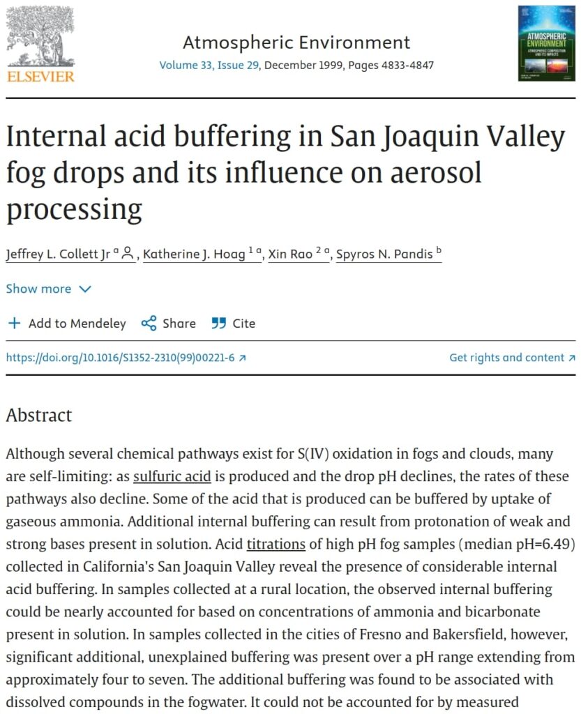 4. Collett Jr., J.L., Hoag, K.J., & Rao, X. (1999). Internal acid buffering in San Joaquin Valley fog drops and its influence on aerosol processing. Atmospheric Environment, 33(3), 537-544. Link to paper