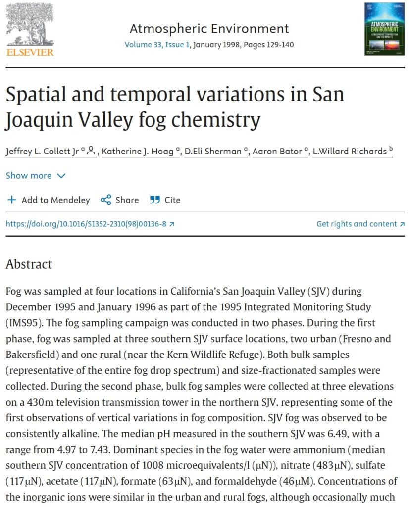- Collett Jr., J.L., Hoag, K.J., Sherman, D.E., & Bator, A. (1998). Spatial and temporal variations in San Joaquin Valley fog chemistry. Atmospheric Environment, 32(8), 1291-1302. Link to paper: https://www.sciencedirect.com/science/article/abs/pii/S1352231098001368