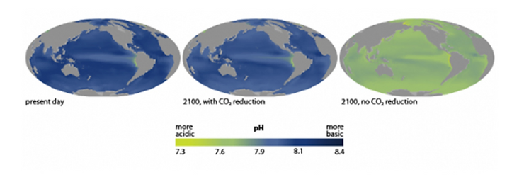 Administration (NOAA), if we don’t take any CO2 emission-limiting steps, our ocean’s surface is predicted to drop to a pH level of 7.67 by the year 2100.[4] Currently, the pH of the ocean’s surface is about 8.1. This drastic 0.43 drop has never occurred in approximately 21 million years and it has potential to become a huge acidic problem; scientists are unsure if ocean life is able to adapt that quickly to the change in acidity. The truth is that ocean life will cease to exist![4] Putting the predicted 0.43 drop in pH into perspective, it could result in a 165% increase in surface ocean acidity and the death of all marine life.