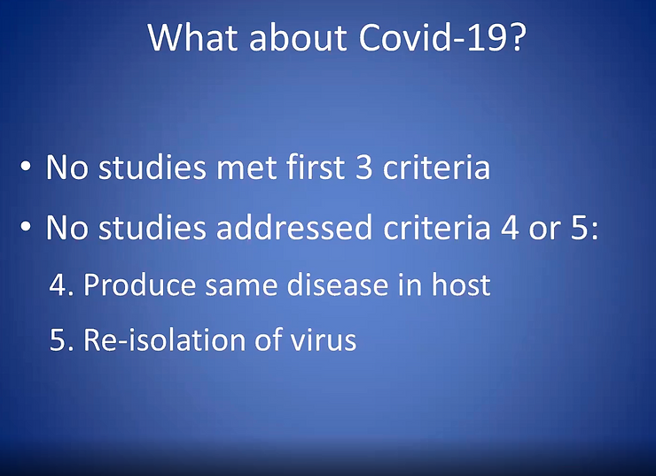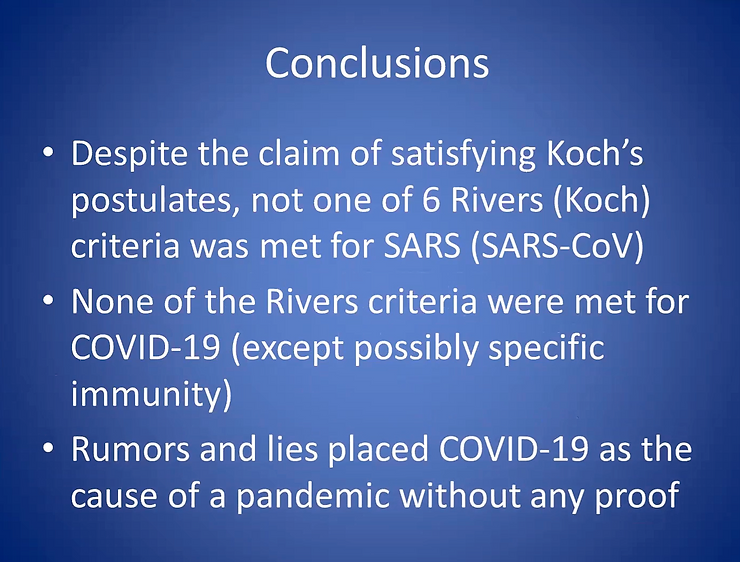 These organizations and other published scientists have admitted in their publications that they had NOT followed Koch’s or River’s postulates for scientific validation of the existence of the so-called CoVid 2 or 19. In other words, the existence of the corona virus is still unproven.