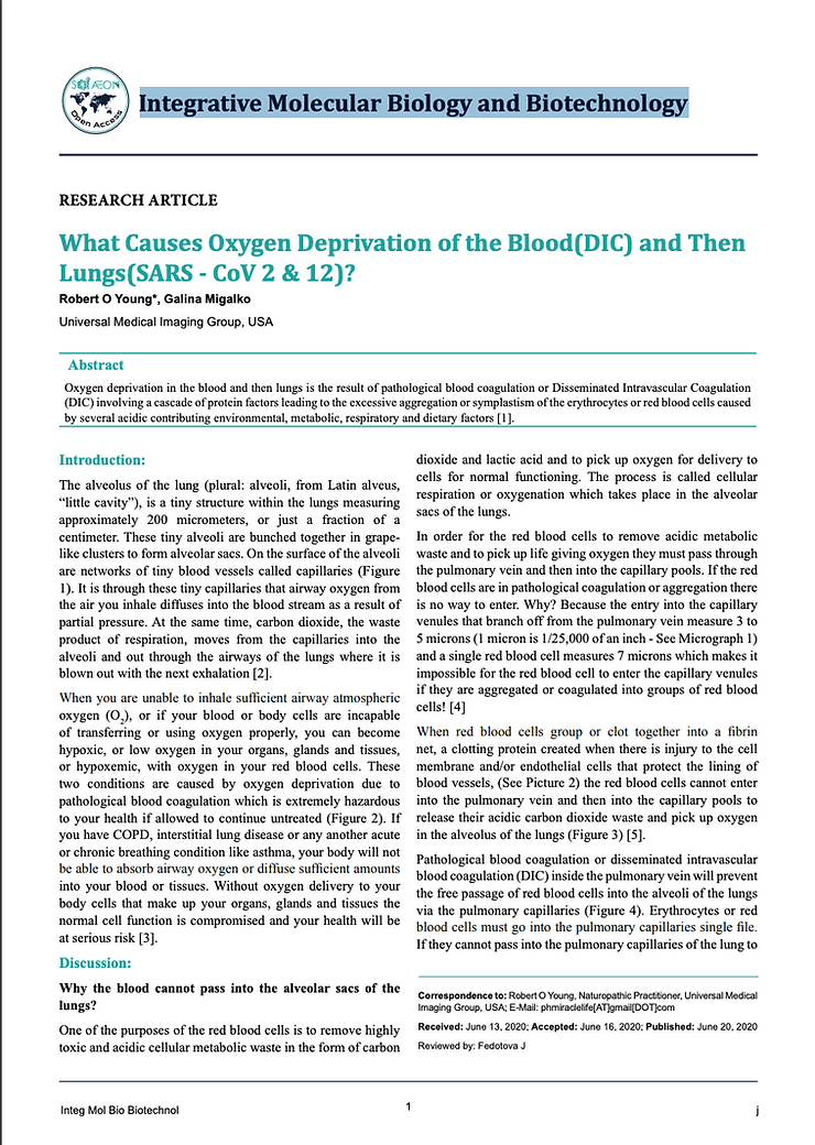 [30] Young RO, Migalko G (2020) What Causes Oxygen Deprivation of the Blood(DIC) and Then Lungs(SARS – CoV 2 & 12)?. Integ Mol Bio Biotechnol 1: 001-007
