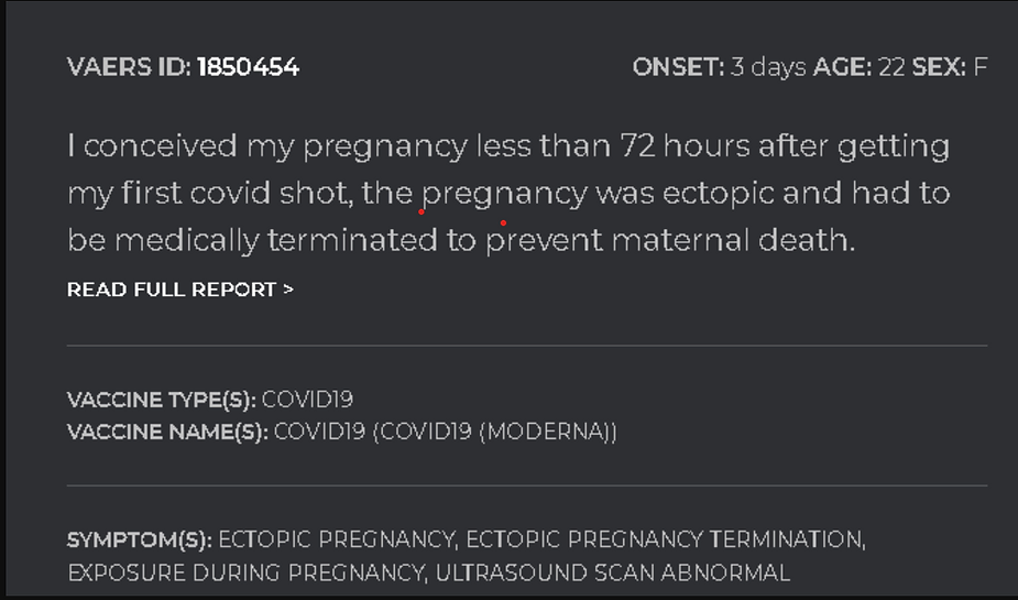 Health Impact News reports that a high number–53 cases–of ectopic pregnancies have been recorded in CDC VAERS–where a woman took the vaccine then found she was pregnant with a fertilized egg growing outside the uterus, a fatal condition which is terminated medically by doctors through surgery or medication, to save the life of the mother. Yet over 30 years, only 30 cases post-all-other-vaccines was found. More here: VAERS Data Reveals 50 X More Ectopic Pregnancies Following COVID Shots than Following ALL Vaccines for Past 30 Years/Health Impact News!