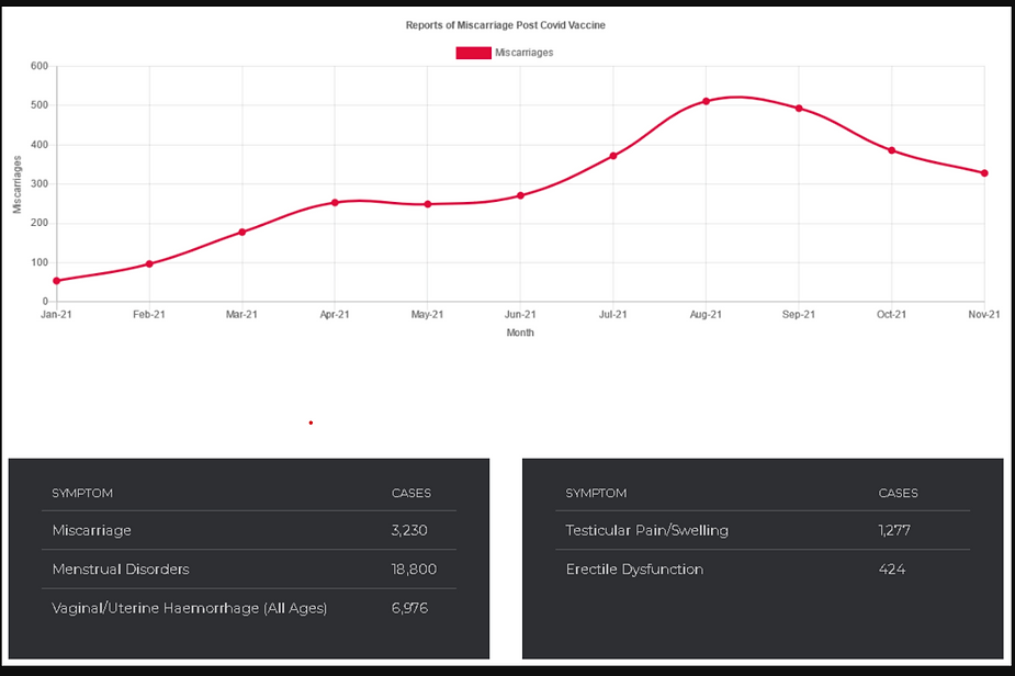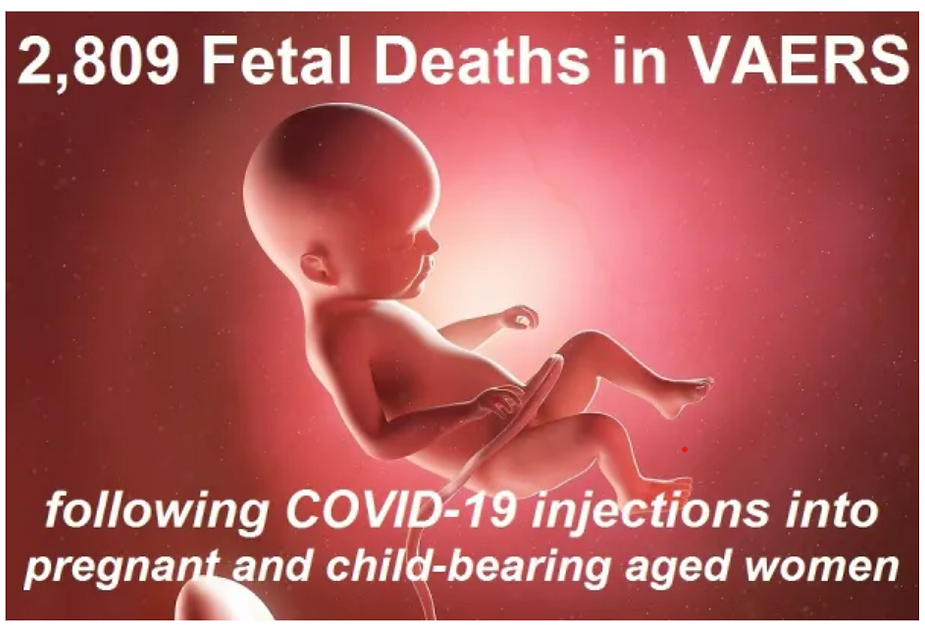 A Dec 4, 2021 compilation article at Health Impact News records numerous studies as well as data from CDC VAERS on the toll currently of fetal deaths from spontaneous abortions–miscarriages in early pregnancy–and stillbirths, noting a total of 2809 fetal deaths post-vaccine.