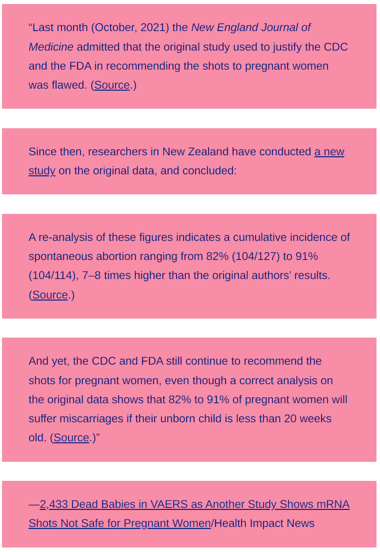 A major study issued in June 2021 and apparently relied on by the CDC to promote “safety” of the COVID vaccine for pregnant “persons” has been challenged by numerous international researchers, analysts, and journalists who found a false statistical analysis, and has now been corrected to reflect the facts of its true findings: