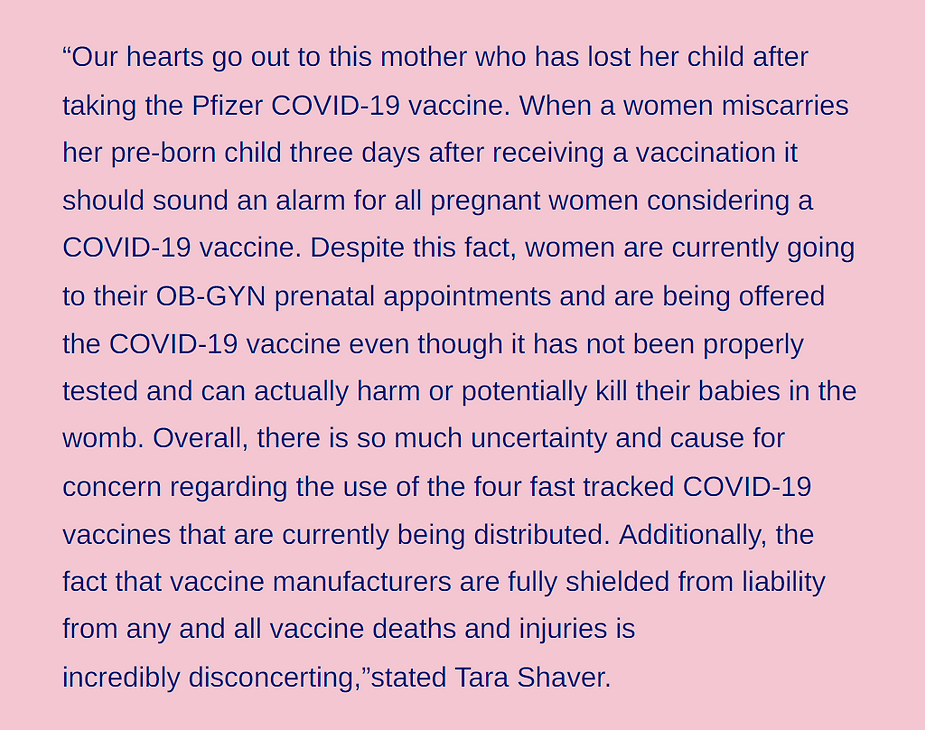 Tara Shaver from Abortion Free New Mexico, remarking on the loss of a third-trimester baby recorded in VAERS and reported here: Breaking: 28 Week Pre-born Baby Dies in Utero After Maternal COVID Vaccination writes:
