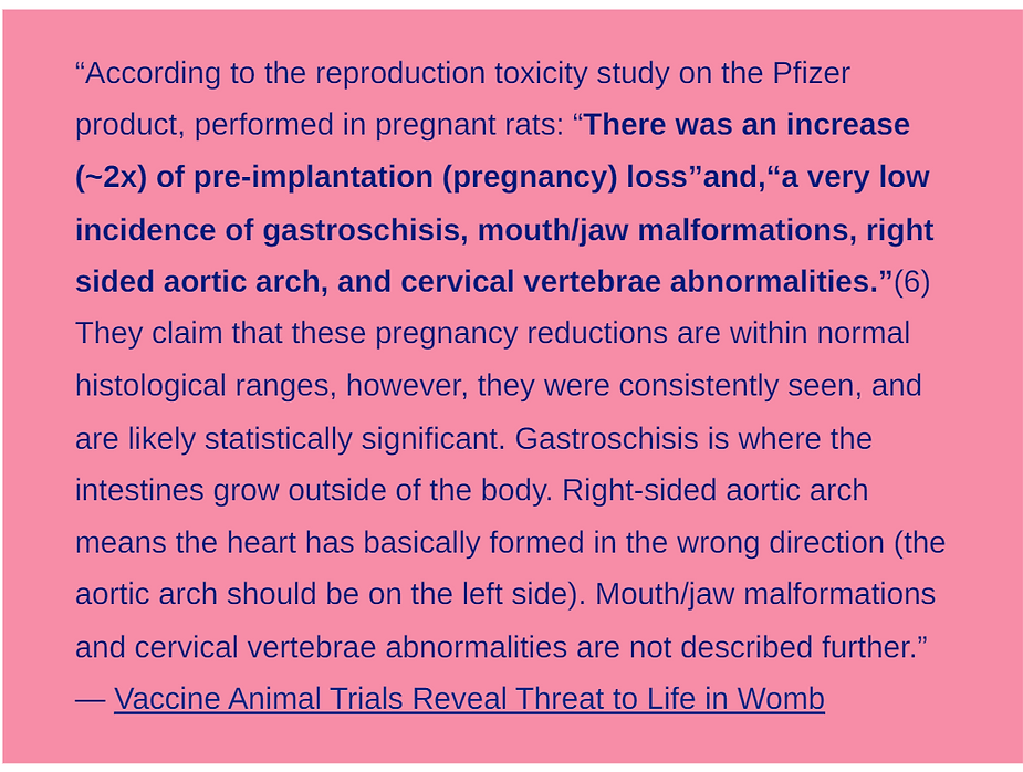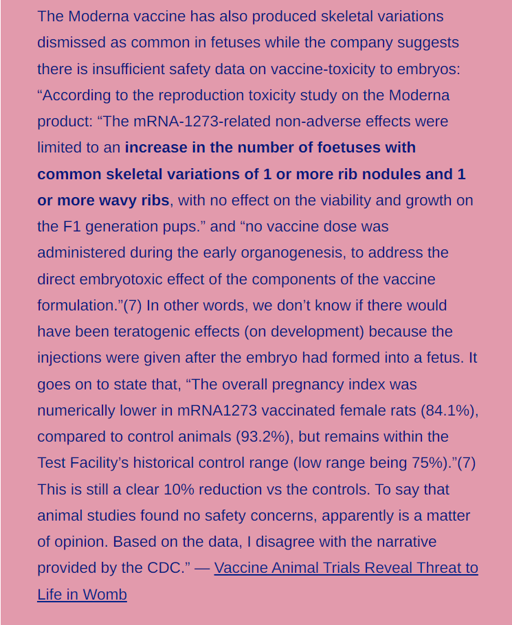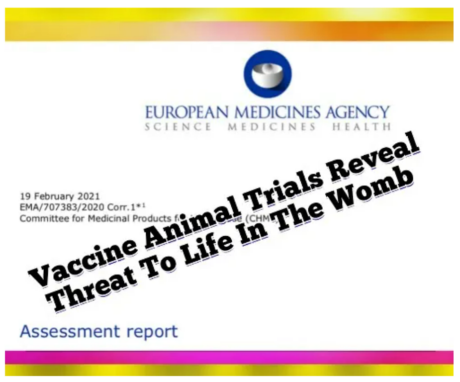 And an animal trial conducted by Pfizer for the EMA and reported by Abortion Free New Mexico: Vaccine Animal Trials Reveal Threat to Life in Womb records numbers of birth defects and pre-implantation pregnancy loss in rats–used extensively in medical research as stand-ins for humans before they run human trials. This information was revealed by a whistleblower to be in the Pfizer factsheets submitted to the EMA, and can be found here: