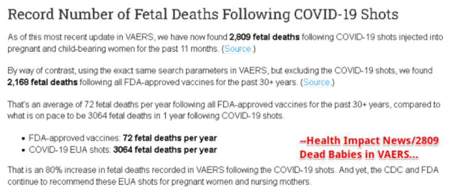 A very interesting study reported by Brian Shilhavy in the above-linked Health Impact News article compares the number of fetal deaths recorded in CDC VAERS over the past 11 months-not even a year–finding 2809 deaths of babies, with the numbers of fetal deaths recorded for all other vaccines over the past 30 years, finding a 72-death per year rate for all, while this year’s COVID-vaccine toll is set to exceed 3000 baby-deaths if the vaccines are not stopped immediately!