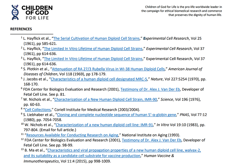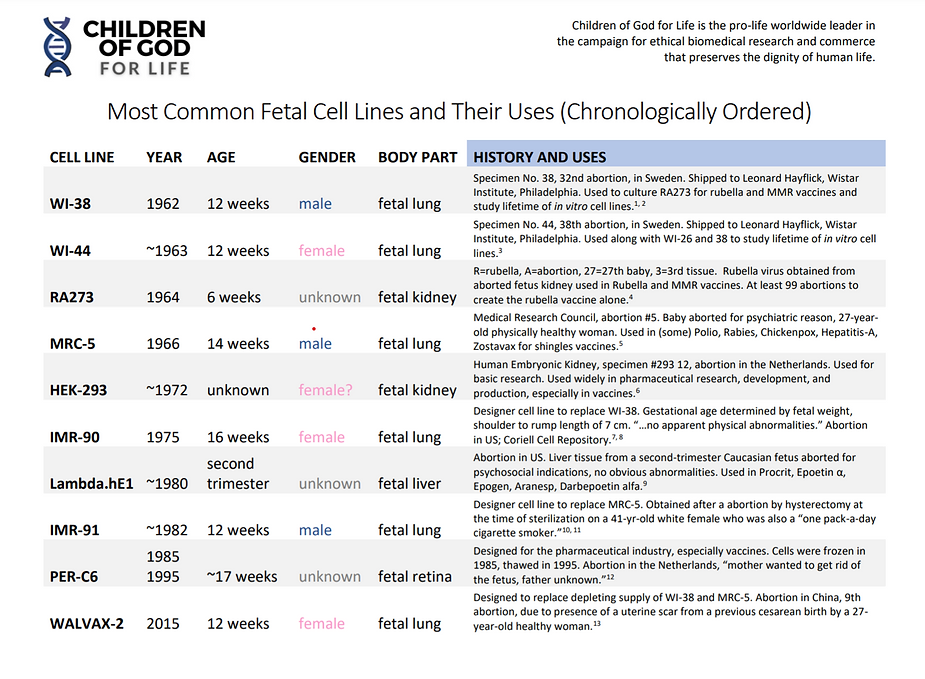Most common fetal cell lines and their sources as compiled by Children of God for Life is posted below (the number codes may be listed on ingredient sheets):