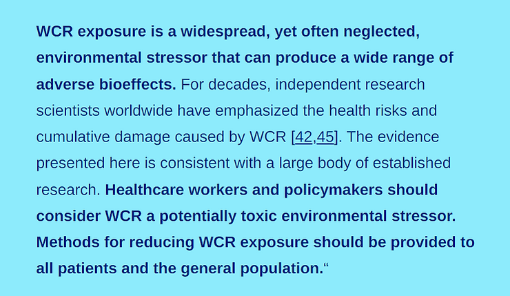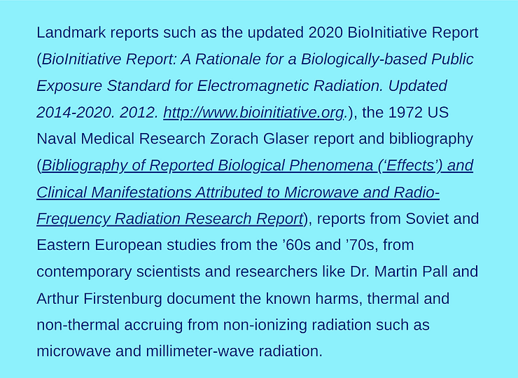 The BioInitiative Report [42], authored by 29 experts from ten countries, and updated in 2020, provides a scholarly contemporary summary of the literature on the bioeffects and health consequences from WCR exposure, including a compendium of supporting research. Recent reviews have been published [43–46]. Two comprehensive reviews on the bioeffects of millimeter waves report that even short-term exposures produce marked bioeffects [47,48]. https://www.ncbi.nlm.nih.gov/pmc/articles/PMC8580522/#B42